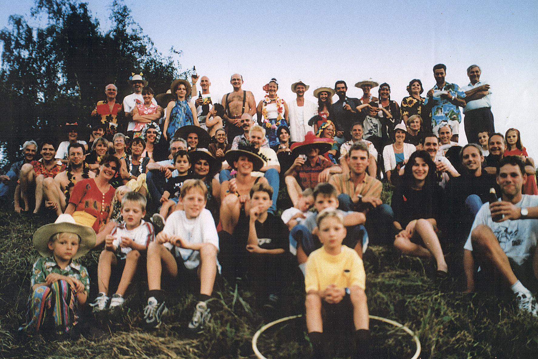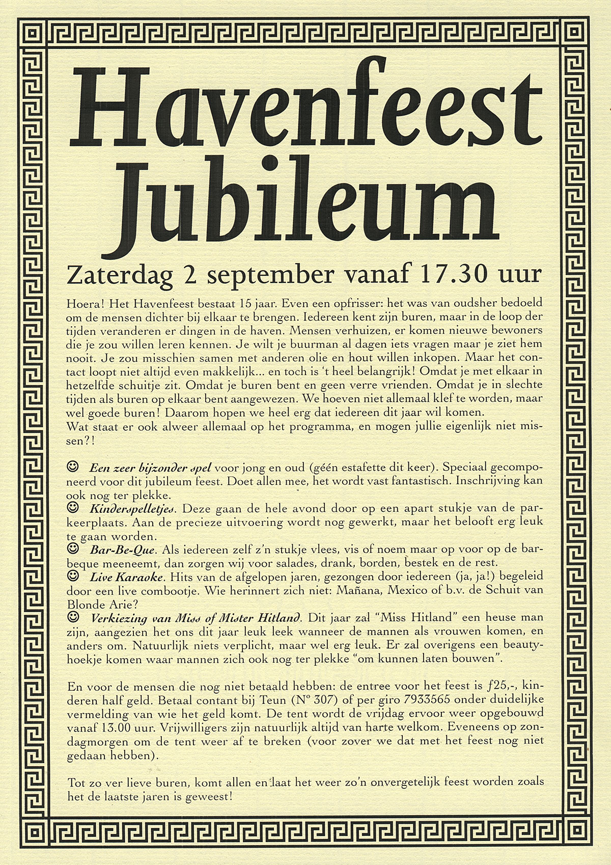Bij een opruim actie vond ik vandaag een foto in een 'oude' doos. Hij is gemaakt op het havenfeest van 1999 en is te leuk om niet te delen. Ik herinner me dat het eigenlijk te laat was, en dus te donker, om nog een groepsfoto te kunnen maken. Dit is een technisch verhaal (over een filmrolletje met een vaste ISO waarde en een grote lensopening met een beperkte scherptediepte) wat ik jullie zal besparen, maar ik ben blij dat hij toch gemaakt is. Het thema was 'Tropical-style' en er staan nog vijftien huidige havenbewoners op. Spaar, uh zoek ze allemaal :) Klik erop voor een vergroting.
